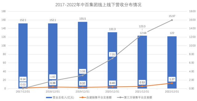 从2017年开始,中百集团发力线上业务。相应的,线上营收从2017年的0.17亿元持续上涨到2022年的17亿元左右。