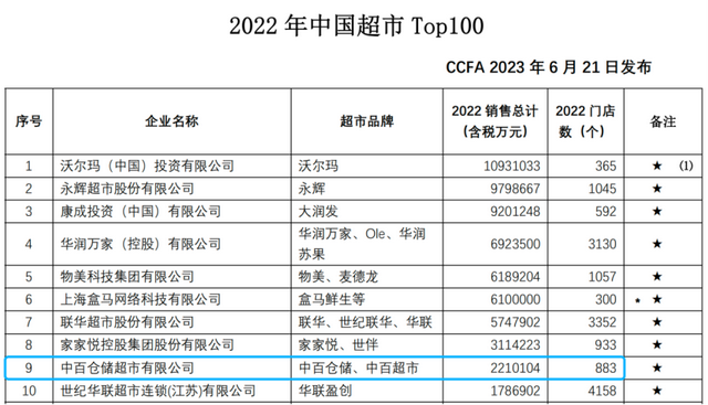其中,中百罗森门店超800家。中百超市、中百仓储以总计883家门店位列2022年中国超市百强榜前十。