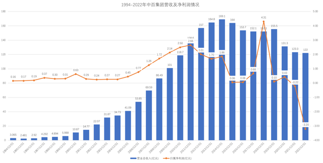 中百集团于1997年在深交所挂牌上市,依据其历年营收情况,笔者认为中百集团主要经历了三个发展阶段。