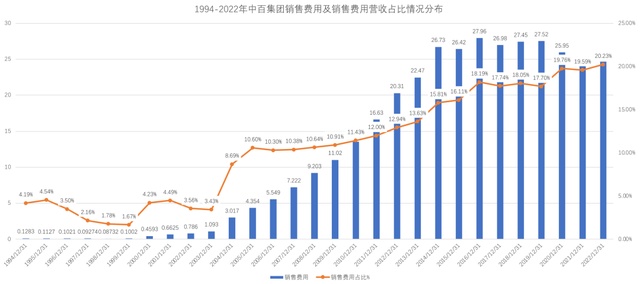 这一点,中百集团明显做的不够。从2014年开始,其销售费用就已经超过24亿元。整体营收占比也逐年上涨,在2022年达到20.23%,再加上管理费用和财务费用,三费小计超过25%,这个数字已经远超其生鲜行业平均20%左右的毛利率。这也侧面反映出中百集团在精细化管理上有所欠缺,对具体费率缺少最小颗粒度的管控能力。