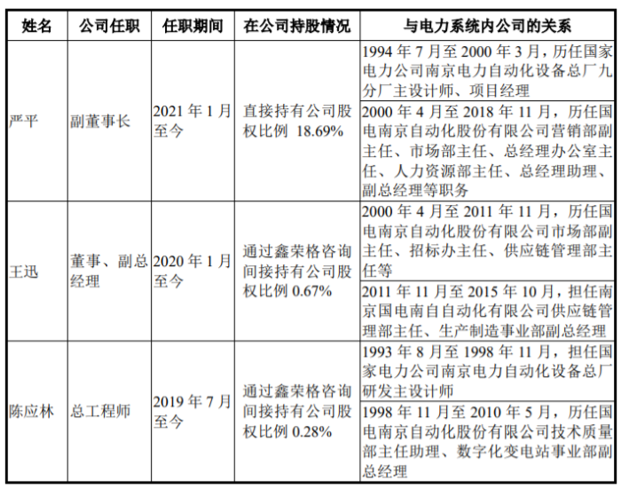 值得注意的是,公司多名高管曾任职于电力系统,副董事长严平曾担任国电南京自动化股份有限公司(简称:国电南自)(600268.SH)副总经理等职务,董事王迅曾担任国电南自供应链管理部主任等职务,总工程师陈应林曾担任国电南自数字化变电站事业部副总经理等职务,技术研发中心副总经理代洁曾在国网电力科学研究院武汉南瑞担任软件部经理等职务,公司成立后不久成为国网供应商。