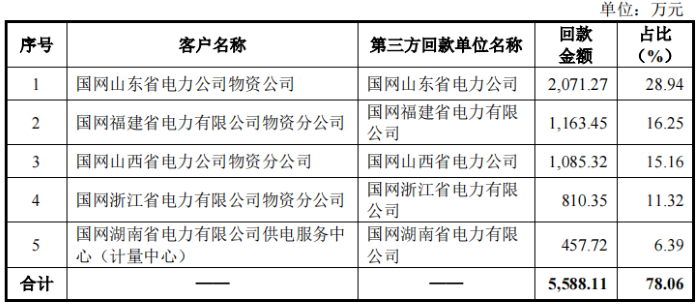 公司第三方回款主要为国家电网及其下属公司客户因自身资金安排及付款的便利性指定其关联公司等代为支付货款,招股书披露的该类第三方回款的金额为5588.11万元,占比78.06%。