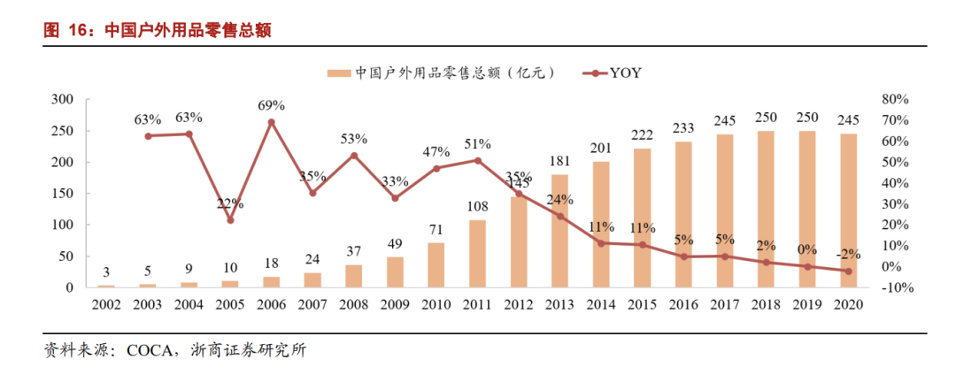 事实上,经历过 2003 年非典、 2008 年北京奥运会催化的高速增长后,户外在 2016 年进入了低增长的瓶颈期。人人都知道未来可期,但谁也不知道未来是什么时候。
