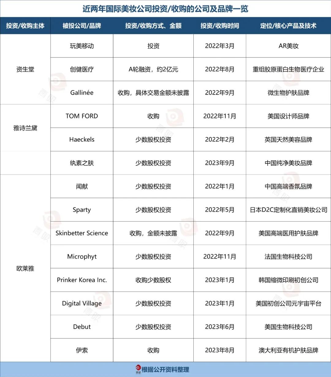 此外,美妆行业日新月异,竞争也越发激烈。面对挑战,不少国际领先的美妆公司均通过投资、收购等动作,由此扩大品牌组合,满足各客群需求和扩大收入体量,从而进一步夯实自身企业的市场竞争力。