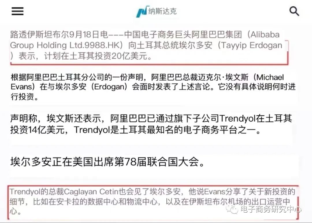 9月18日,阿里巴巴集团旗下土耳其电商公司Trendyol在一份声明中表示,阿里巴巴计划未来一段时间在土耳其投资20亿美元(约合145.92亿元人民币)。