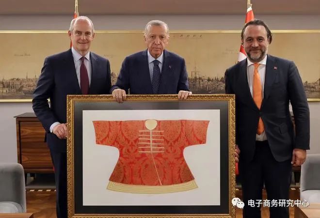 网经社注:阿里巴巴集团总裁迈克尔·埃文斯(左)、土耳其总统埃尔多安(中)和Trendyol总裁恰拉扬·切廷(右)