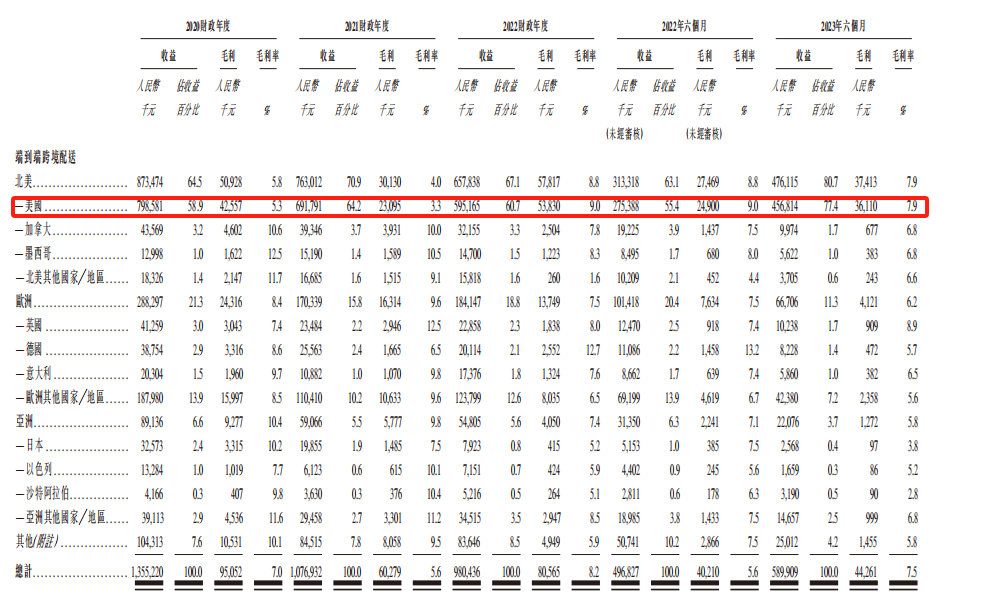 此外,我们发现一个很有意思的现象,泛远国际主要做美国业务,2023年上半年的收入占比高达77.4%。这份成就,一方面值得尊敬,但另一方面其风险也不可忽视。
