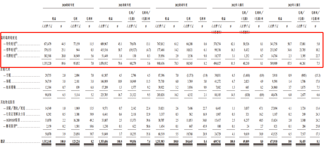 在业务层面,泛远国际的主要业务有三项,分别是端到端跨境配送、货运代理以及供应链解决方案。其中,端到端跨境配送是其主营业务,收入占比近90%,而这里面又主要是特快配送(3至5日达),收入占比近50%;其次是标准配送(6至9日达),收入占比34.6%。在国际跨境物流中,能实现5日内送达,是很考验能力的。