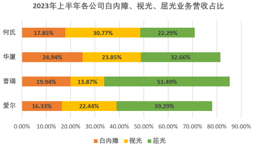 具体到细分业务,白内障、屈光、视光业务是各家眼科医疗机构的主要营收来源。这三项业务营收贡献之和在各家公司多处于80%的水平。