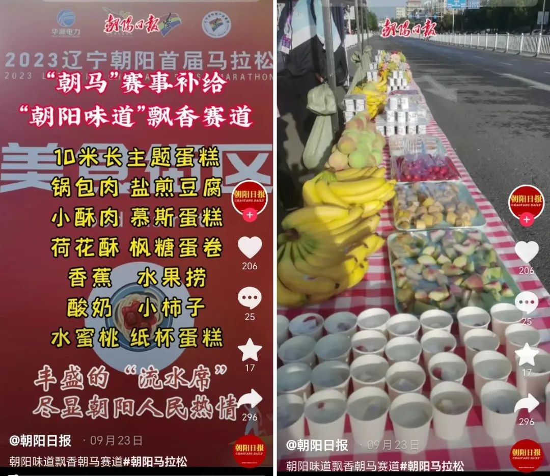 一般来说,马拉松参赛选手们都喜欢在社交平台上发布关于跑步本身的视频,但赛事挪到东北后,场边的补给站却成为了重点。9月底在辽宁朝阳的马拉松比赛中,因为沿途补给物实在丰富,香肠、烧鸡、小酥肉、锅包肉......有人忍不住发问:“这是跑到东北早市里了吗?”