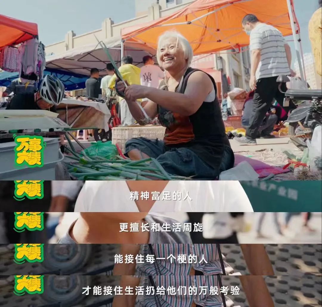 新上映的纪录片《万事大集》拍摄了沈阳造化大集,其中一位卖菜的阿姨造型独特,醒目的全白头发做成公主切和小辫子结合的造型,搭配阔腿牛仔裤和杂色凉鞋,向大家讲述自己的经历:多年前,她得了癌症,“胃和子宫全切除,晚期癌都活过来了”,她说:“人活着就得开心地活着”“同志们想开一点啊,开心地活着,开心乐乐的一天”。