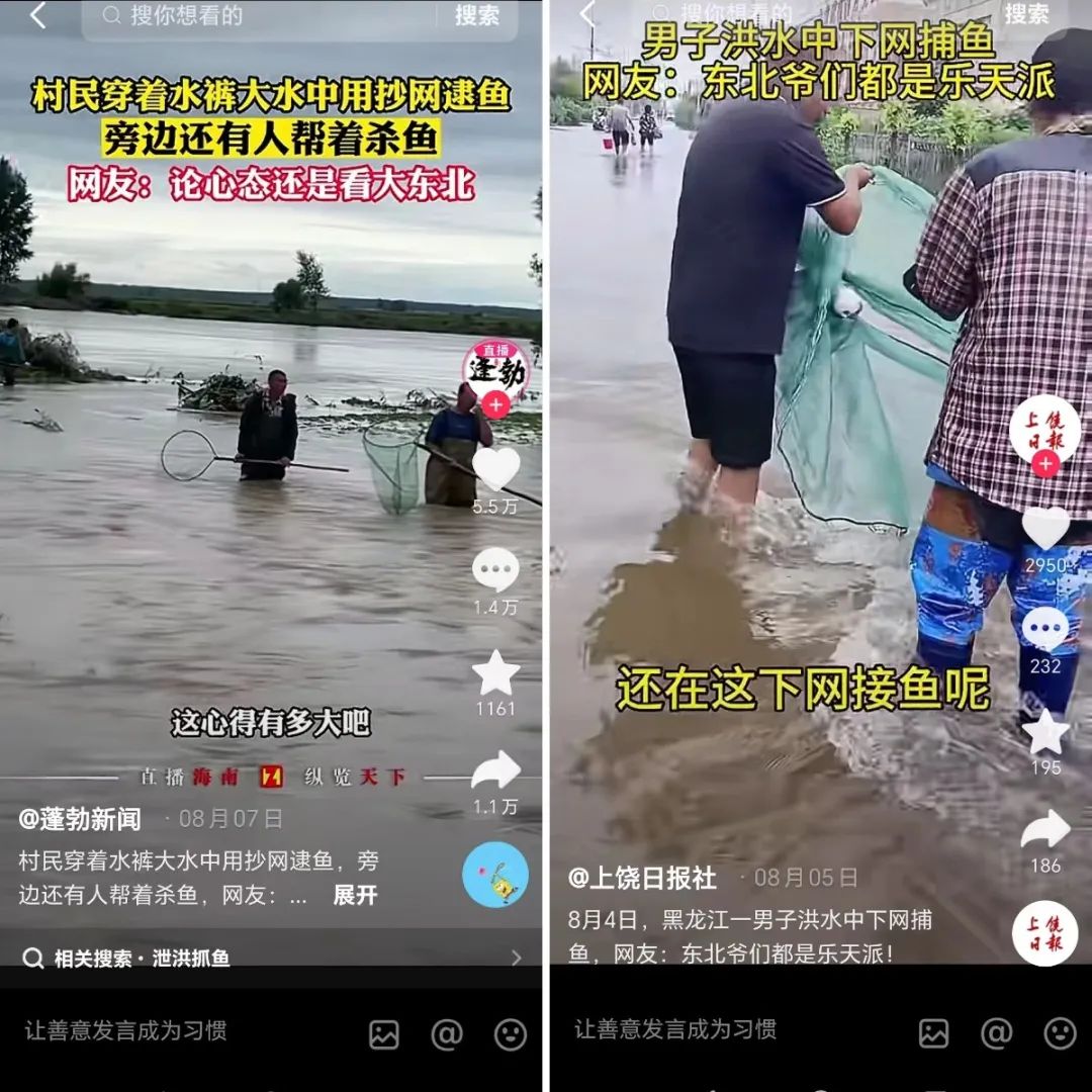 有人自家房屋、农田被淹,依然选择在水没过大腿的道路上铺下渔网,准备捞鱼,还有人连渔网都不用,空着手就上阵抓鱼,而录视频的家人们即使有的在嘴上埋怨着他们“心大,不知道上火”,却也没有真的责怪和生气,还在视频最后说:“看看一会儿有没有鱼吧”。