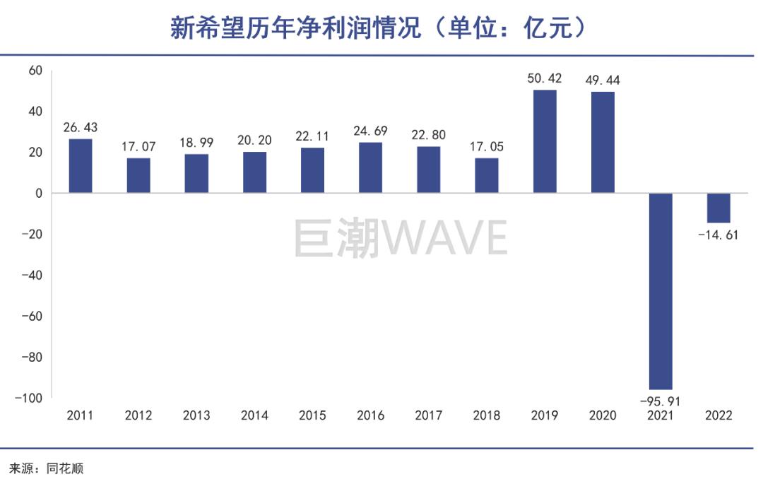 走过了最辉煌的2019-2020年,新希望随即陷入亏损泥潭。2021-2023年上半年,合计亏损140亿元,比那两年赚取的100亿元还多亏了40亿元。