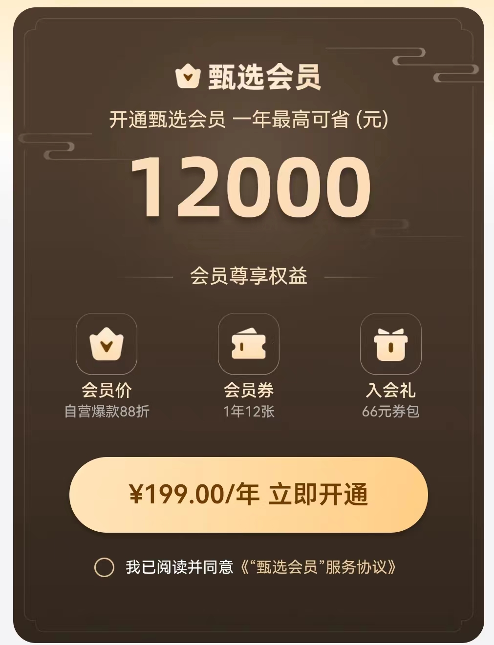 界面教育发现,东方甄选APP页面推出“甄选会员”,或将启动APP付费会员模式。会员定价199元/年,付费会员可享受百款自营品88折、一年12张会员券、66元券包入会礼等专属权益,付费会员一年预计最高可省1.2万元。