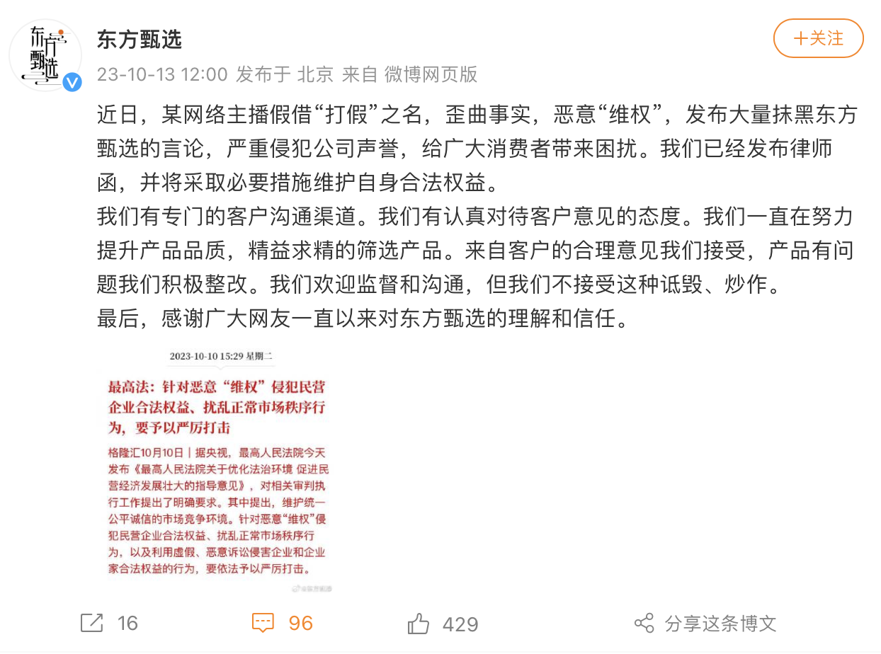 东方甄选还在微博图片中引用了最高法近日发布的《最高人民法院关于优化法治环境 促进民营经济发展壮大的指导意见》给予回应,“针对恶意‘维权’侵犯民营企业合法权益、扰乱正常市场秩序行为,以及利用虚假、恶意诉讼侵害企业和企业家合法权益的行为,要依法予以严厉打击。”