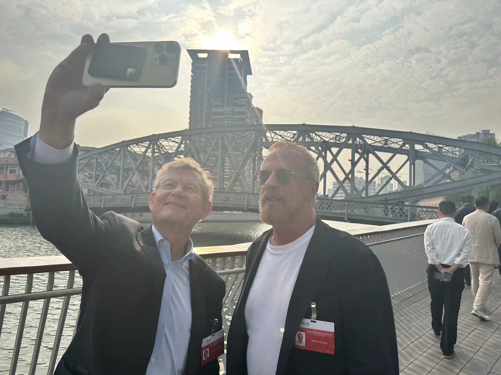 在苏州河与黄浦江交汇处,两位共同关注人工智能领域的“大咖”——银瑞达董事会主席、市咨会前主席雅各布·沃伦伯格和欧洲科学院院士汉斯·乌斯科尔特,在河畔游览接近尾声时,有默契地拿出手机,共同在外白渡桥前开心自拍。