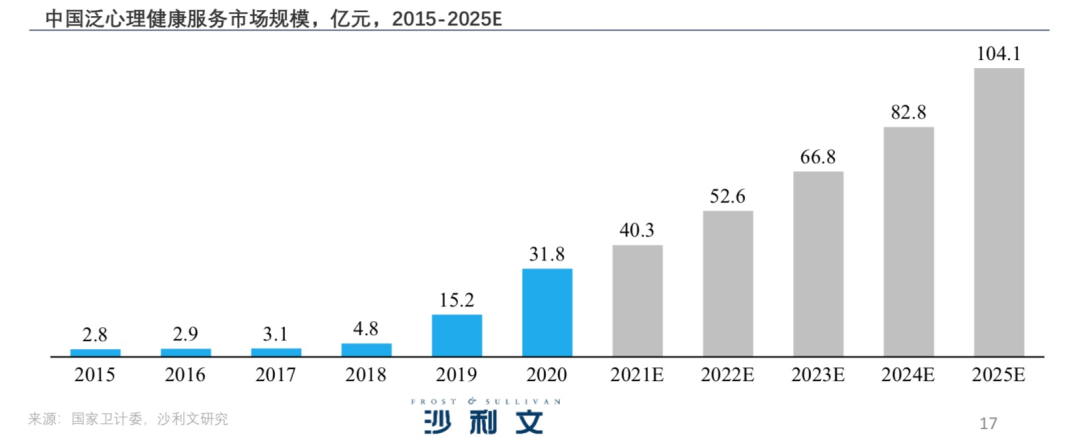 咨询公司沙利文发布的《2022中国泛心理健康服务行业白皮书》显示,中国泛心理健康服务市场规模由2015年的2.8亿元增长至2020 年的31.8亿元,年复合增长率达62.9%。据预计,2025年中国泛心理健康服务市场规模将达到104.1亿元,年复合增长率将达到34.5%。