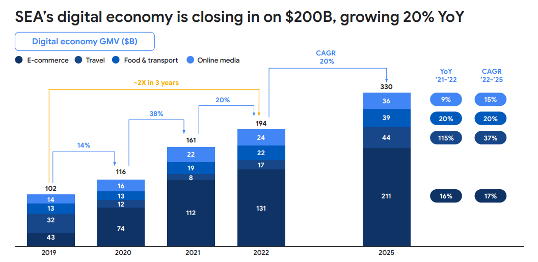 新一波中国品牌正是看重了这一市场蓬勃发展的电商生态。根据淡马锡、贝恩和谷歌联合发布的《2022东南亚数字经济报告》,东南亚数字经济的GMV规模在2022年达到1940亿美元,同比增长20%,比2016年发布的报告预期数据提前了三年,与此同时,报告预计2022到2025年东南亚电商的预期复合年均增长率将达17%。