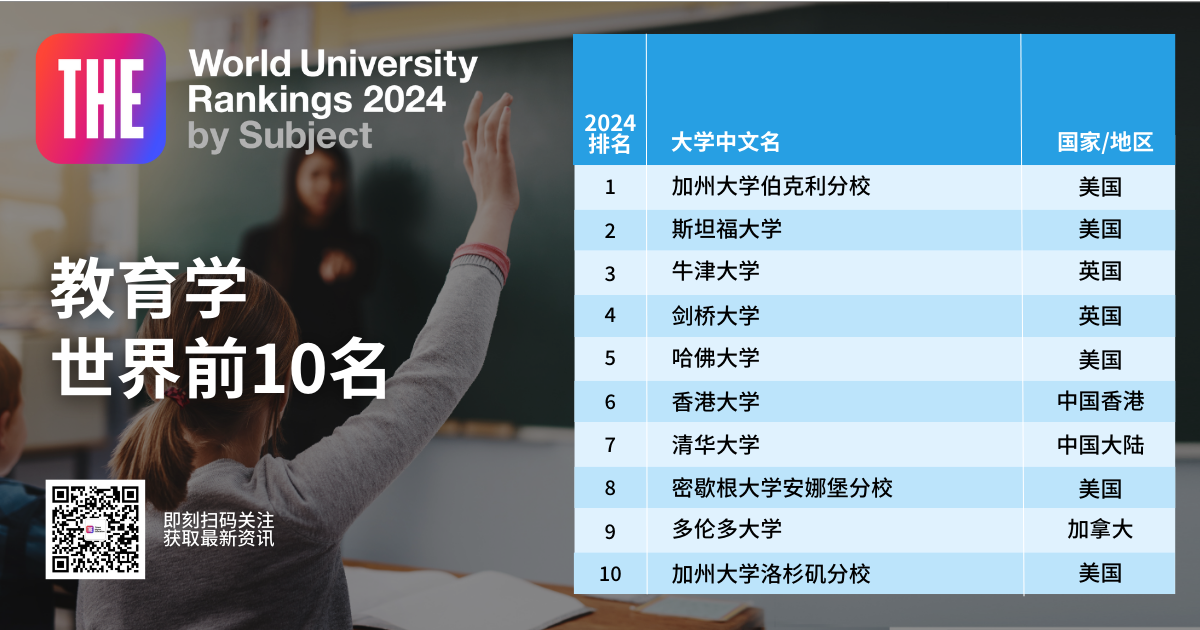 在教育学学科的排名中,五年前,前十名中有九位被美国和英国高校占据,中国香港仅占据一位。今年前十名的学校来自五个国家/地区:中国内地、加拿大、中国香港、美国和英国。