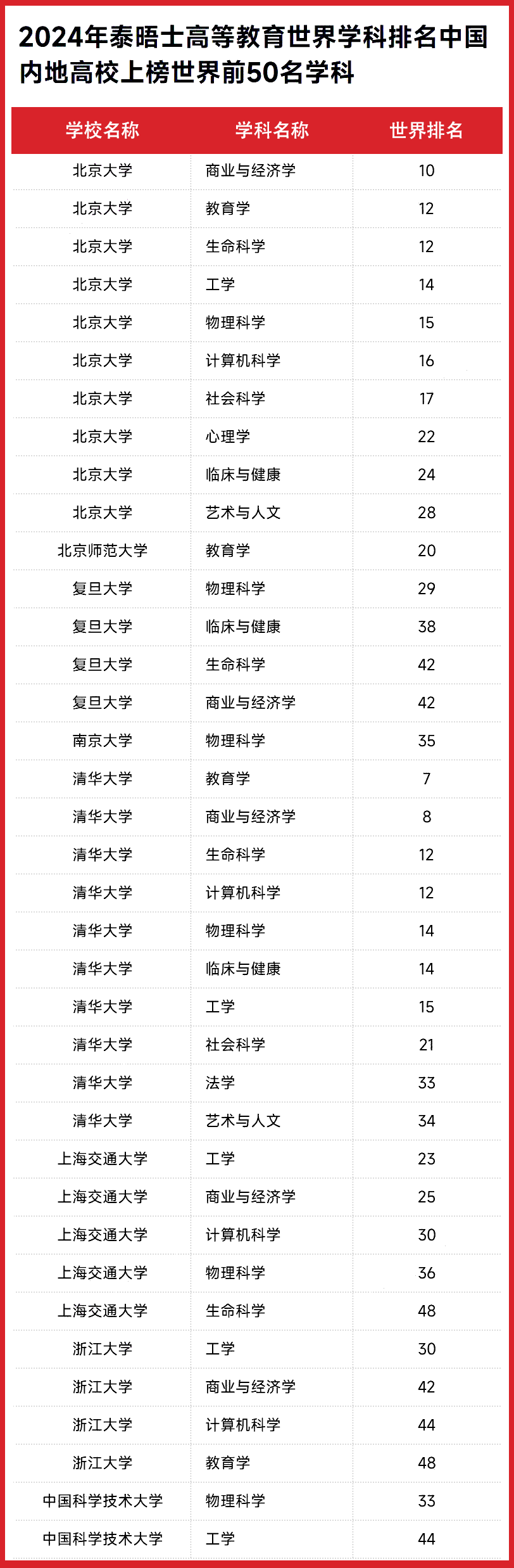 据中国教育在线统计,2024年泰晤士高等教育学科排名世界前50中,中国有八所高校37个学科上榜。