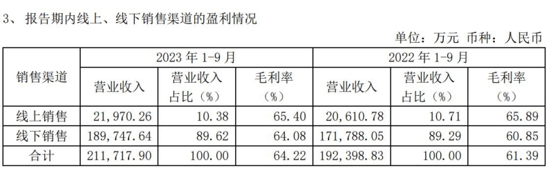 九牧王的营业收入近九成来自线下销售,这跟当今人们热衷于线上购物的流行趋势很不一样。整体看,九牧王在2023年1-9月的线上销售与线下销售的营业收入比例基本平稳,未出现很明显的结构变动。