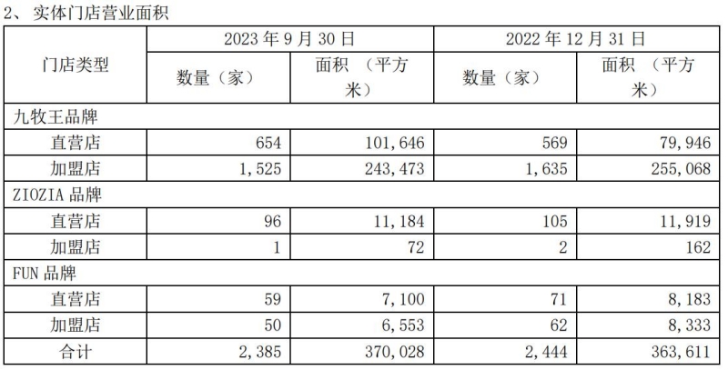 在9月30日,九牧王品牌实体门店数量合计2179家,占三大品牌实体门店总数的91.36%,其营业面积(直营店和加盟店)合计达34.51万平方米,占三大品牌营业面积合计数的93.27%。值得一提的是,在九牧王的三大品牌中,只有九牧王品牌的直营店营业面积跟年初相比出现增长,其余均为营业面积减少。整体上,2023年1-9月九牧王实体门店数量虽有所减少,但是营业面积是增长的。