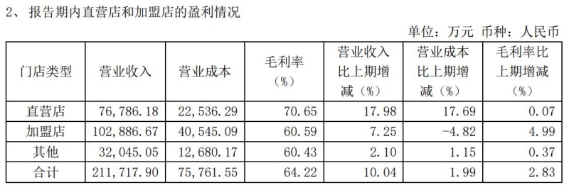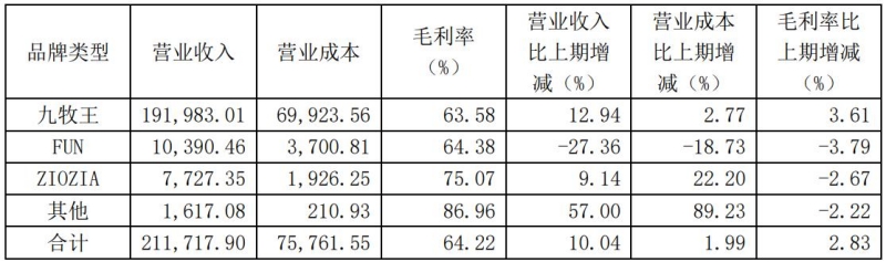 其中,九牧王品牌实现的19.20亿元收入是主力,占各品牌收入合计数的90.69%,毛利率为63.58%,低于其他品牌毛利率,不过和上期相比增加了3.61个百分点。另外两个品牌FUN和ZIOZIAA收入分别为1.04亿元和0.77亿元,毛利率比上期分别减少了3.79个百分点和2.67个百分点,另外,FUN品牌收入比上期减少了27.36%。