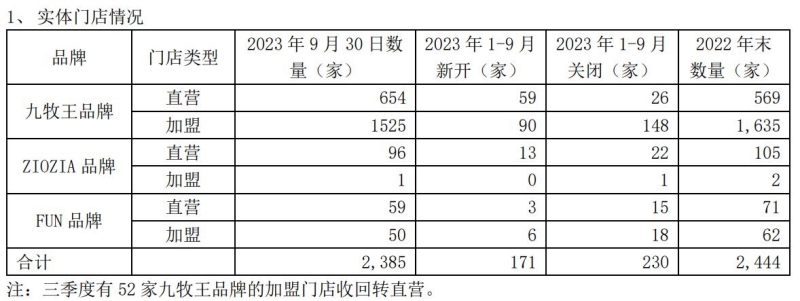 九牧王品牌和ZIOZIA品牌的实体门店数量也比年初减少了一些。2023年1-9月,九牧王品牌实体门店关闭了174家,ZIOZIA品牌实体门店关闭了23家。合计算来,三大品牌的实体门店在2023年前三季度关闭了59家。