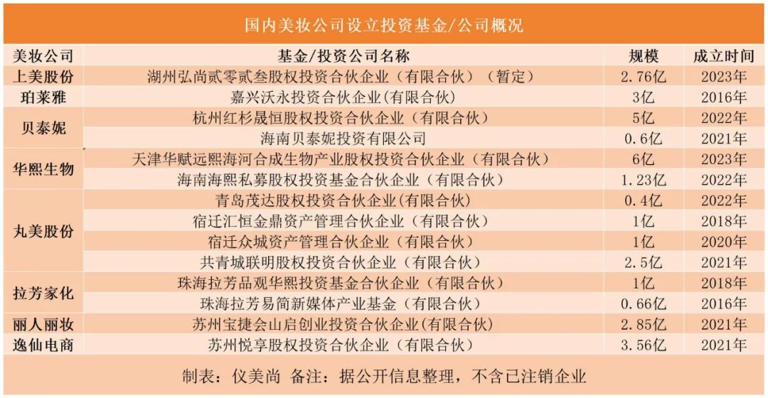 据仪美尚不完全统计,近年来,至少有8家本土美妆企业,成立了14家基金/投资公司,基金总规模近32亿元。投资方向遍布美妆品牌、MCN机构、合成生物、医美机构、代工厂、自媒体等。