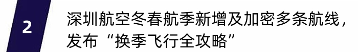 2023年10月29日起,我国民航进入冬春航季。深圳航空结合旅客出行需求,预计在冬春航季新增国内航线5条、加密18条,国际执飞航线将覆盖10国。新增南通往返兰州、郑州往返宁波/长春、哈尔滨往返昆明(经停南昌)等航线。同时,深圳航空在开航30周年之际推出全新“躺飞”系列公务舱,大仰角云端躺飞椅,让旅客在云端舒适躺飞。选乘全价公务舱的旅客,还可尊享9大服务权益,包括豪华车接送、专属出行秘书、专属值机柜台、专属快速安检通道、优先行李提取、远机位VIP摆渡车等。随着“躺飞”公务舱品牌焕新,更多活动也将逐步开展。