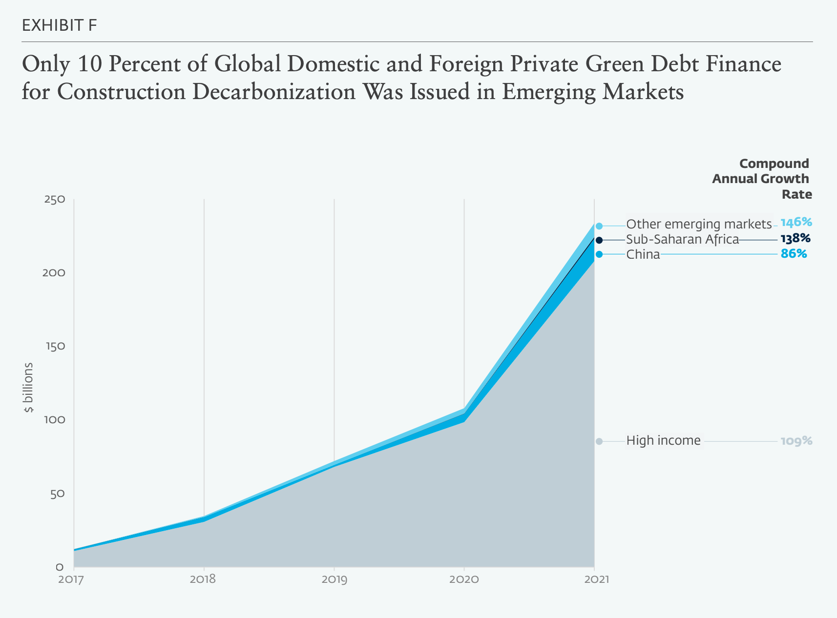 IFC报告显示,发展中国家建筑业仅获得了10%的私人绿色投资,与这些国家的绿色金融及建筑业的市场化机制失灵有关,如建筑行业集中度不高、监管高度地方化、从业者在政策知晓方面的信息鸿沟等等。