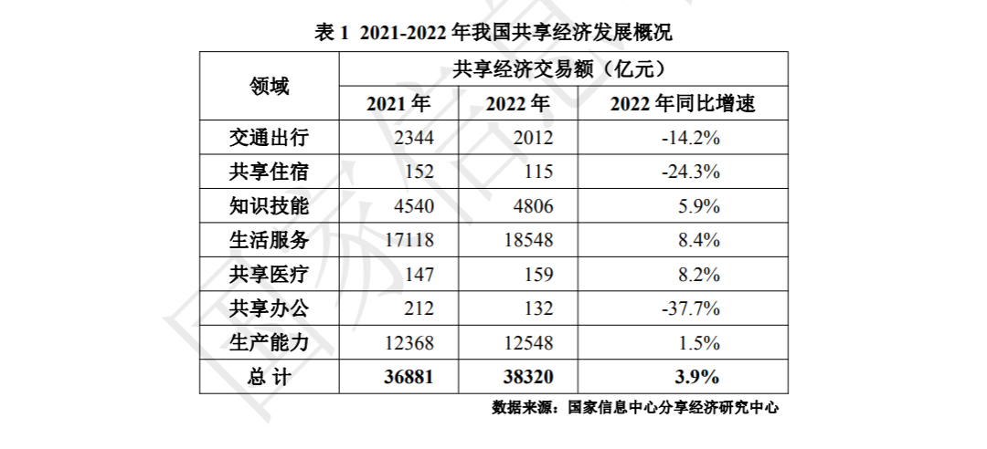 国家信息中心发布的《中国共享经济发展报告(2023)》显示,2022年我国共享经济市场交易规模约为38320亿元,同比增长3.9%,较2021年的增速9.2%有所放缓。但从类别来看,此次数据统计将“在线外卖”、“在线医疗”等也纳入了范畴,共享经济的概念似乎有扩大的趋势。
