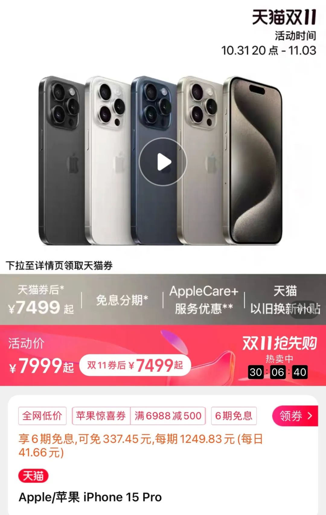 9月份,库克刚发布iPhone15系列新品,10月中下旬,市场上就传出“iPhone15全系价格暴跌”的消息。另据市场调研机构Counterpoint报告,iPhone15在中国首发17天内,销量较前代机型下降了4.5%。《凤凰WEEKLY财经》注意到,目前在Apple京东自营旗舰店领券之后,iPhone 15系列手机最高可优惠800元左右。在Apple Store天猫官方旗舰店,iPhone 15、iPhone 15 Plus可享满5688元减700元的活动,iPhone 15 Pro和Pro Max则满6988元减500元,并且6期免息。