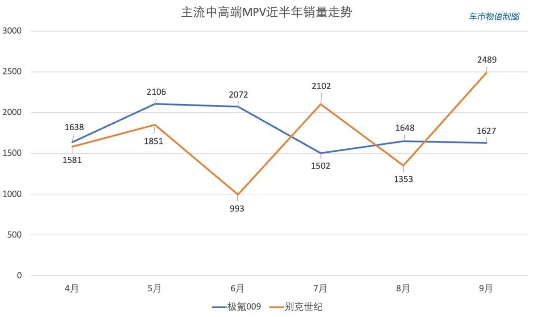 而更高端的MPV市场中,极氪009与别克世纪的销量不相上下,月均也维持在2000台左右,可以看到,大家对中国品牌高端化是认可的,对高端MPV市场有需求。