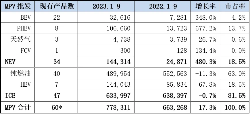 2023年1-9月,新能源MPV销量增长明显(图片来源:乘联会)