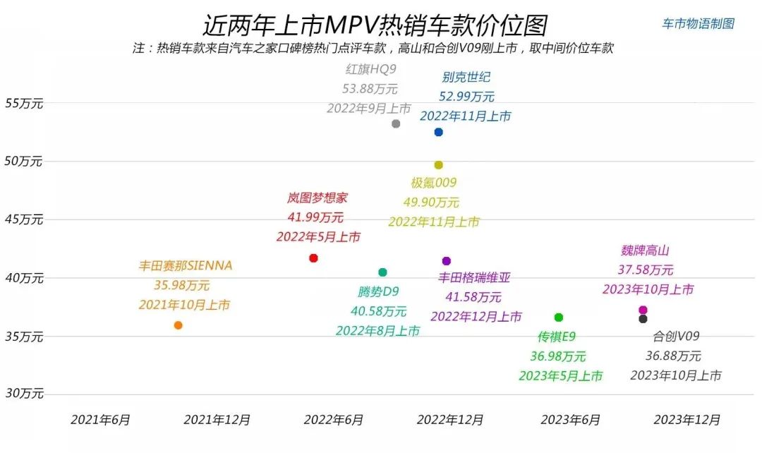 近两年上市MPV热销车款价位图:普遍在36-42万元(车市物语制表)