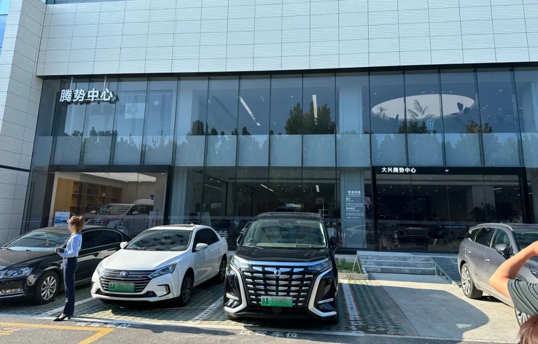 走访的另一家位于北京大兴南六环附近的腾势门店,虽然位置比较偏,但是周围不乏奔驰、宝马、奥迪、捷豹路虎、林肯等豪华品牌门店,甚至还有兰博基尼、阿斯顿·马丁等超豪华品牌门店,以及劳斯莱斯的售后服务中心。可以看到这里是比较小众的“奢饰品”汽车消费聚集地,这家腾势门店也如周围的环境一样,看上去“高大上”,完全不同于过去中国品牌门店的形象,店内装修同样很有档次,近似豪华品牌门店的形象,店内的销售也非常热情,进店就给消费者递水,并热情询问需求。门店内的消费者并不是很多,但是几个消费者都对店内C位的腾势D9表现出了更高的热情。