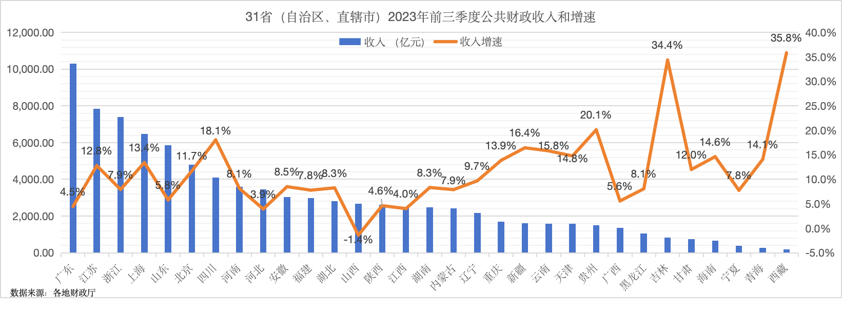 日前,全国31省(自治区、直辖市)均已公布了2023年前三季度财政收支情况,有15个省份一般公共预算收入同比增速跑赢了全国8.9%的水平,其中,6个省份上半年财政收入增速超过了15%。