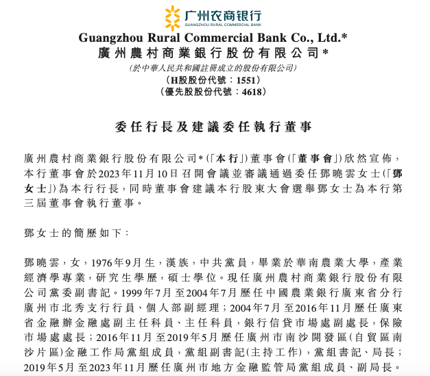 11月10日,广州农村商业银行(01551.HK)公告称,该行董事会于11月10日召开会议并审议通过委任邓晓云为行长,同时董事会建议该行股东大会选举邓晓云为第三届董事会执行董事。邓晓云担任广州农商行行长的任职资格尚需国家金融监督管理总局广东监管局核准。