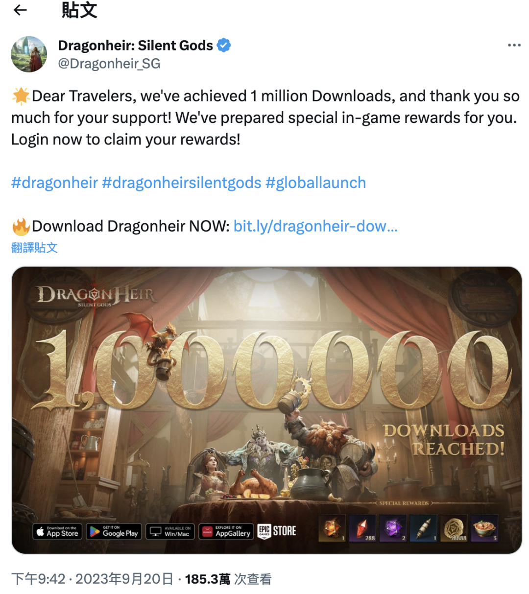 1、根据官方Twitter发布的消息来看,产品上线前的预约人数超300万、上线第二天总下载人数超100万。这个成绩,不能说差,但也没有达到让人眼前一亮的程度。这表明,产品还是存有一定的局限性,没有得到太多泛游戏用户的加入。