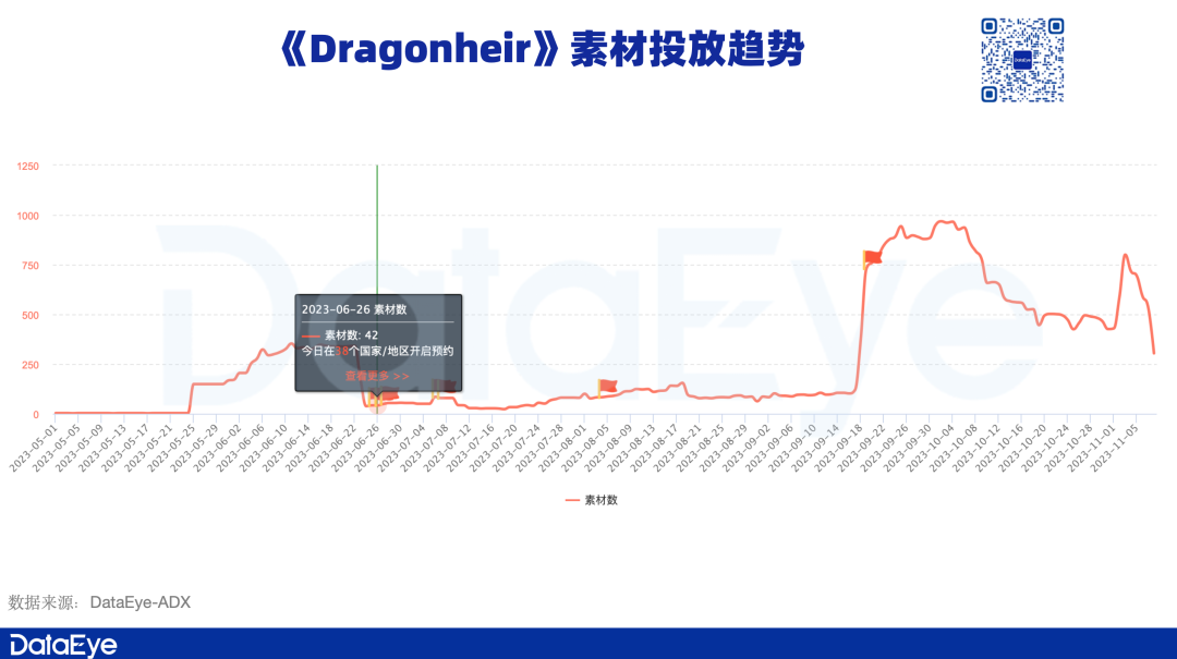 DataEye-ADX海外版投放数据显示,《Dragonheir: Silent Gods》在上线前四个月就开始进行素材测试,但日均测试素材组数并不高。直到9月19日,该产品在海外多个市场上线,投放素材量快速拉升。9月25日当天达到投放峰值,单日投放近1000组素材。随后投放量有明显的下滑。