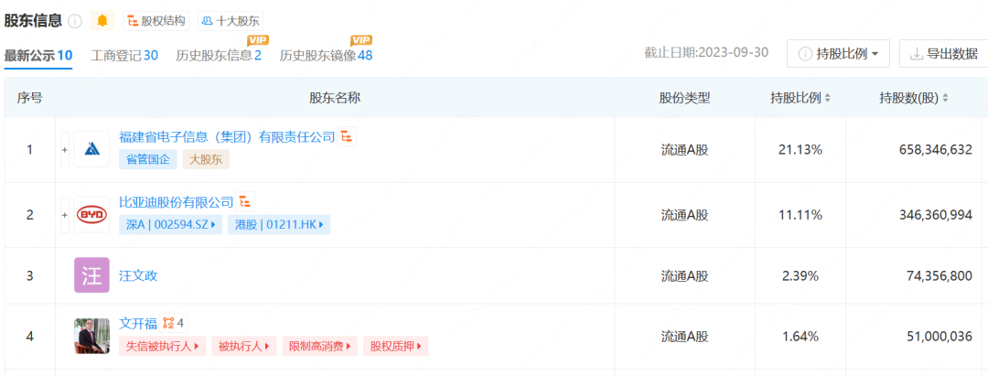2018年底,福建国企福建电子入股成为第一大股东,文开福持股比例下降至15.06% ,并在接下来的时间里,逐步减少持股数量,截至2023年第三季度末,文开福持股比例仅1.64%,持股数量仅5100万股。