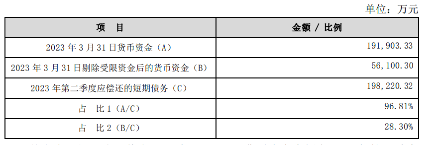 实际上,在今年1季度末的时候,合力泰的现金流就已经显现出违约风险。截至2023年一季度末,合力泰货币资金约19.19亿元,剔除受限资金后约5.6亿元,2023年第二季度应偿还短期债务约19.82亿元,剔除受限资金后的资金余额仅占短期债务的28.3%。