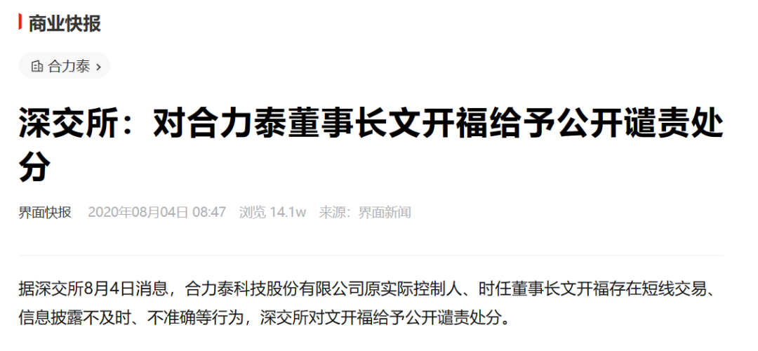 2020年8月4日,深交所的披露了合力泰原实控人、时任董事长文开福存在短线交易、信息披露不及时、不准确等行为,对文开福给予公开谴责处分。2020年底,文开福持有合力泰股份比例从13.76%下降至8.32%,持股数量减少约1.7亿股。