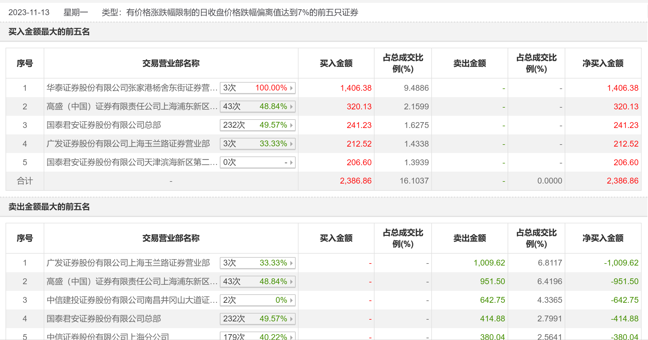 11月13日,汇通能源今日跌停,全天换手率达3.64%,振幅达10.53%。龙虎榜数据显示,营业部席位合计净卖出1011.94万元。其中,广发证券上海玉兰路证券营业部、高盛(中国)证券上海浦东新区世纪大道证券营业部分别卖出1009.62万元、951.50万元;华泰证券张家港杨舍东街证券营业部、高盛(中国)证券上海浦东新区世纪大道证券营业部分别买入1406.38万元、320.13万元。