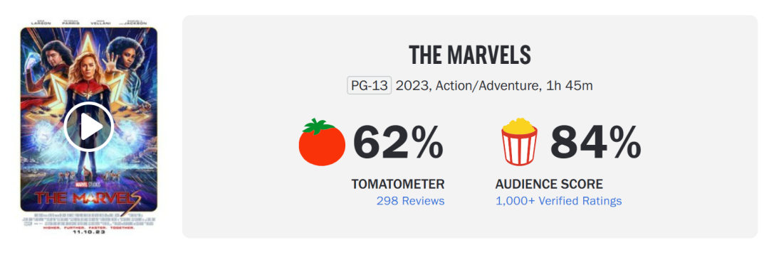另一方面,《惊奇队长2》的故事情节与多套流媒体剧集存在强关联,显著抬高了普通影迷的观看门槛。雪上加霜的是,与电影剧情直接承袭的《惊奇少女》是观看量最少的漫威Disney+剧集,而同样由塞缪尔·杰克逊主演的《秘密入侵》则恶评如潮,对提升《惊奇队长2》的好感度并无助力。