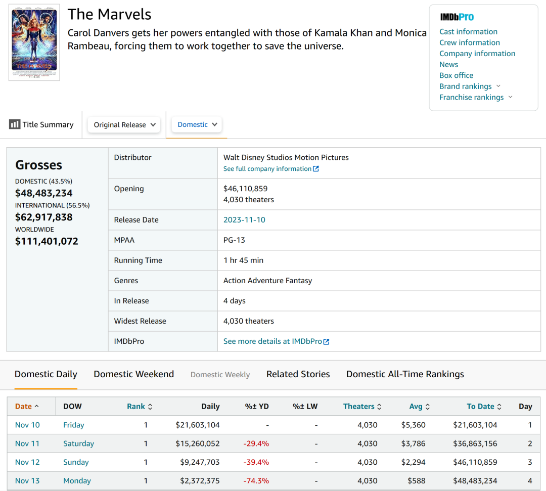 值得一提的是,《惊奇队长2》全长只有1小时45分钟,成为“漫威电影宇宙”系列最短的院线片,此前《无敌浩克》和《雷神2:黑暗世界》均为1小时52分钟。与此同时,《惊奇队长2》的制作成本达到2.748亿美元,只少于超3亿线的《复仇者联盟》第2至4部,是漫威单体超英作品中最昂贵的项目。在The-Numbers发布的单片预算榜中,《惊奇队长2》足以排到影史第14名,超过迪士尼的史诗级“哑弹”《异星战场》。