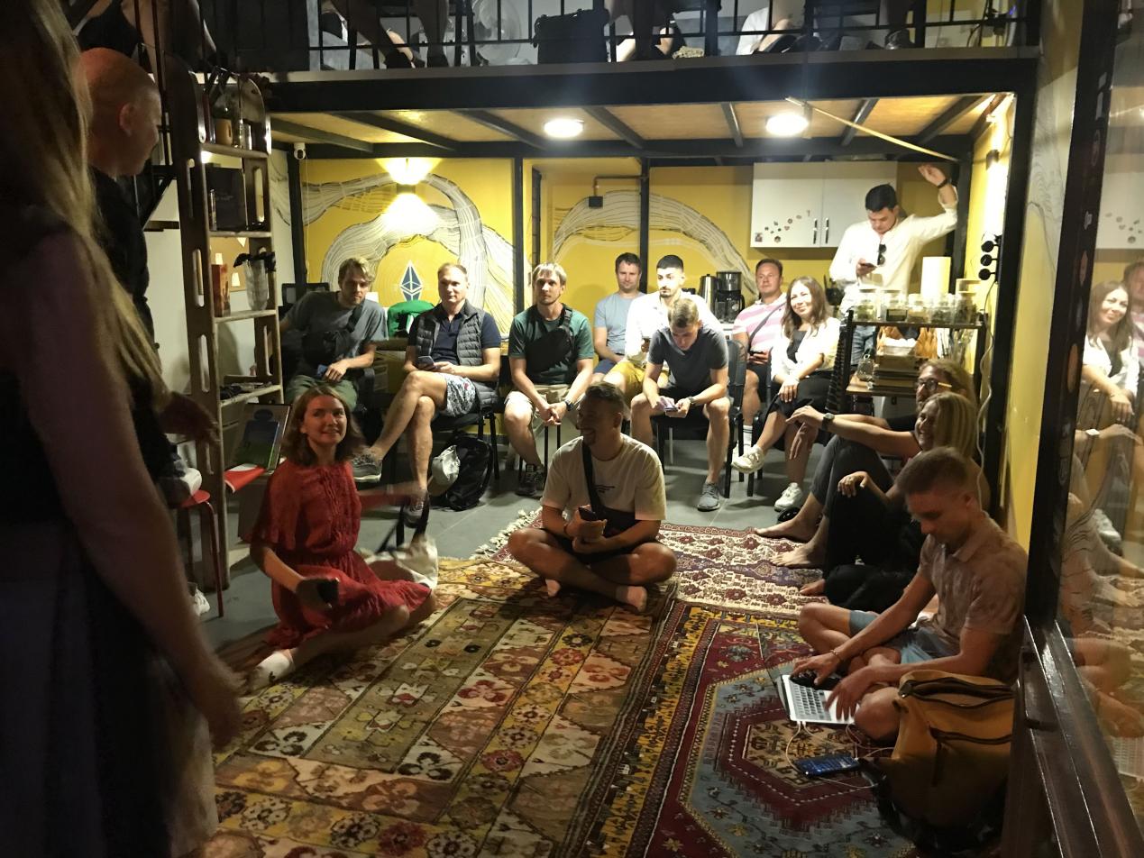 下午晚些时候通常是用来游泳的,然后是社区组织的活动、研讨会或课程。他和朋友、同事经常在当地的咖啡馆或酒吧里参加一些社交活动来结束一天的工作,大家最长去的办公场所是一个狭小的、有着二层结构的房间,门框上是手绘的比特币和以太坊的Logo,灯光有些发黄,地上铺着土耳其特色的手工毛毯,毯子看起来很舒适,许多人会直接席地而坐。