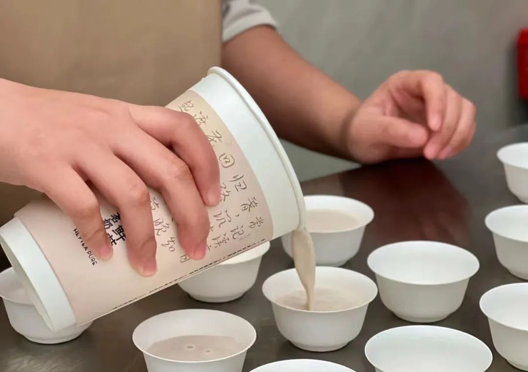 在现场,可以看到制茶的全过程,店员磨茶碎、压粉、高温萃取茶液一气呵成,店内弥漫着一股茶香。