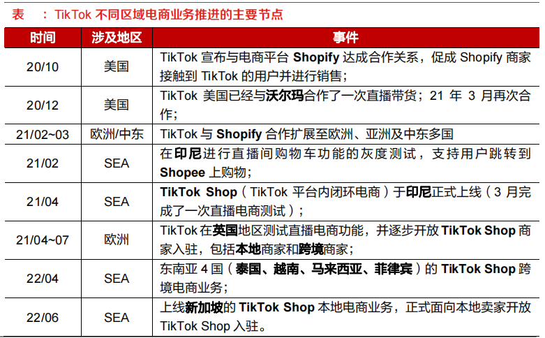TikTok不同区域电商业务推进的主要节点,图/东方证券